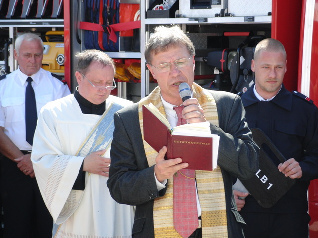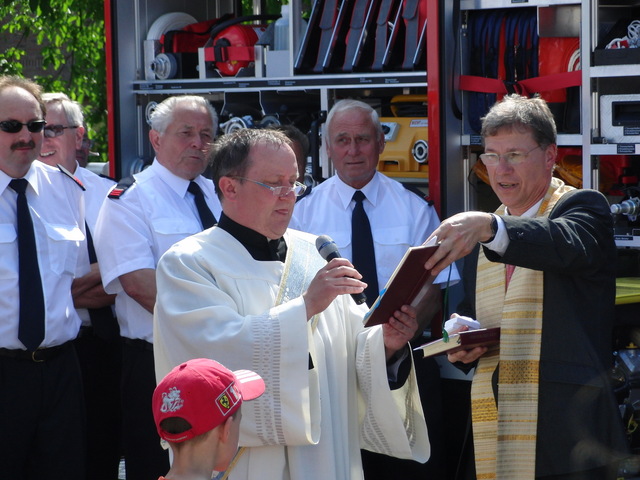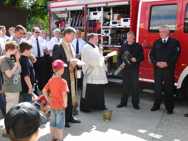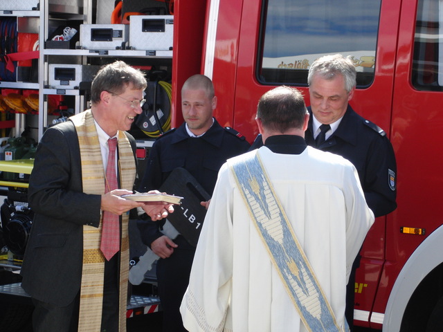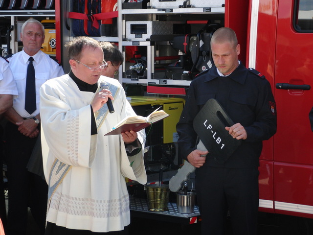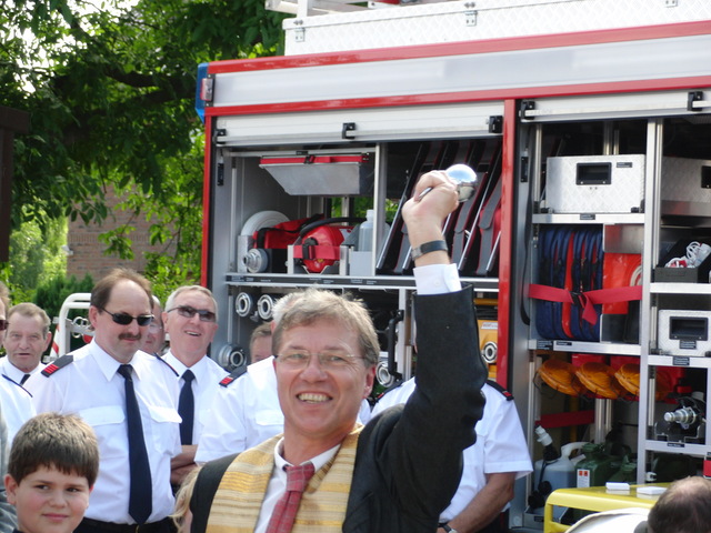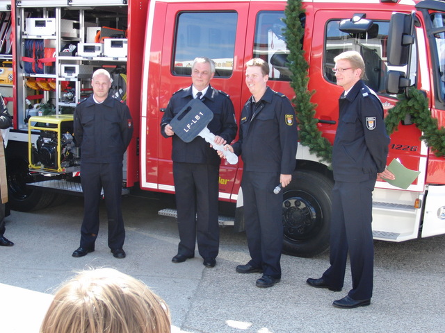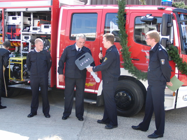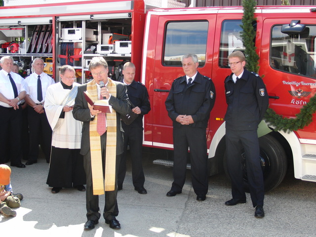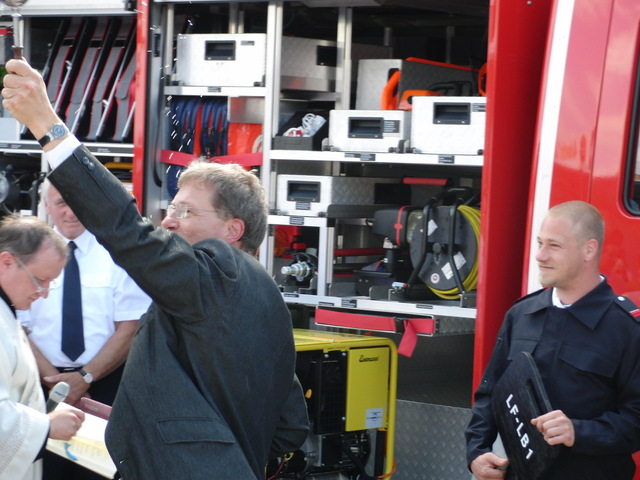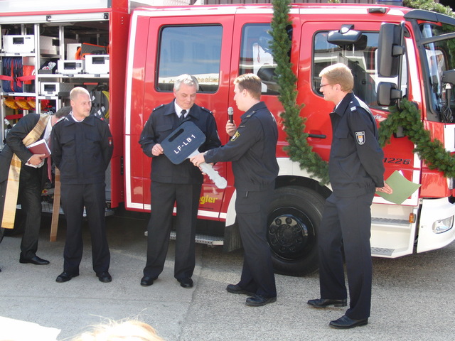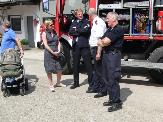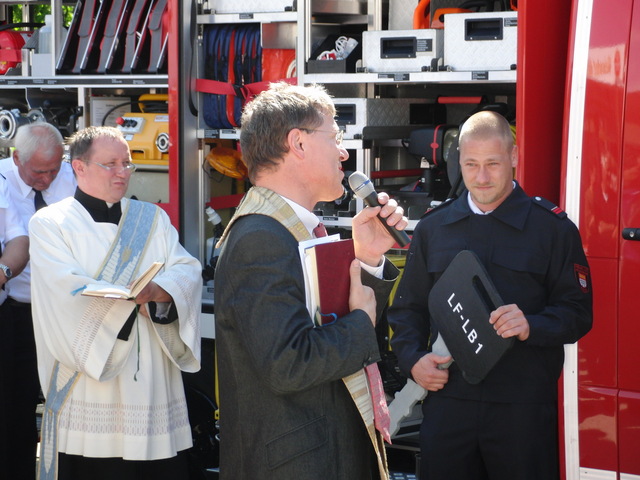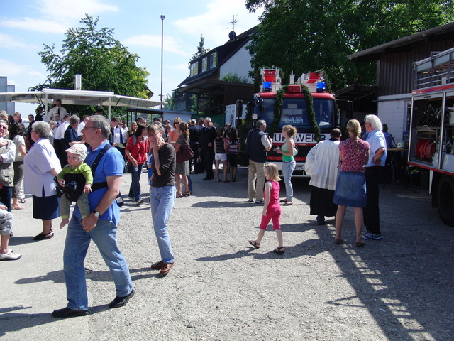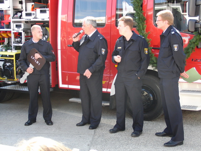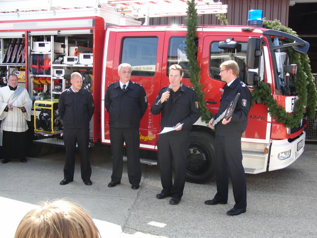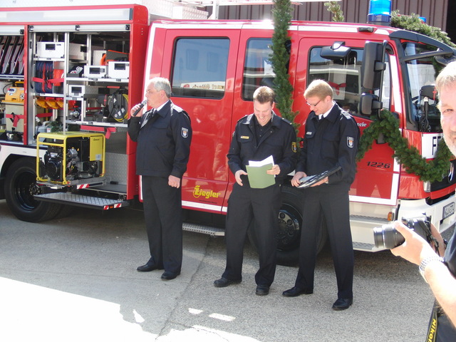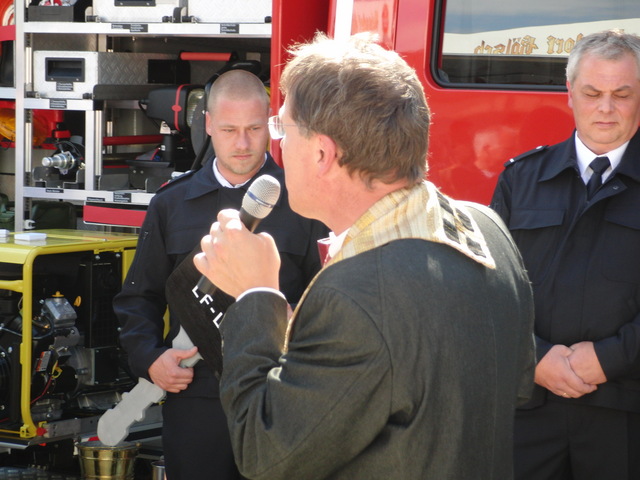 Schon zu Beginn der Veranstaltung um 15 Uhr füllte sich der Hof vor unserer Unterkunft schnell und verglichen mit den bisherigen Veranstaltungen sehr gut. Als um 16 Uhr dann die Schlüsselübergabe und Segnung unseres neuen Einsatzfahrzeugs eingeläutet wurde, war der Platz um das neue Fahrzeug proppenvoll. Brandrat Adrian Röhrle war – wie auch schon bei der