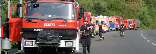 Schlange stehen an der Kaffeekanne.Gut gestärkt für den Einsatz folgte dann eine kurze Einweisung in die zwei für diesen Tag geplanten Übungen, die Einteilung der Fahrzeuge und die Bekanntgabe der geplanten Alarmierungsreihenfolge. Im Aufstellungsraum angekommen nahm auch der Funkverkehr auf dem bis dahin stillen Übungskanal 489 langsam Fahrt auf. Der Fernmeldedienst der Feuerwehr Köln exerzierte die Funkprobe, es meldeten sich etliche