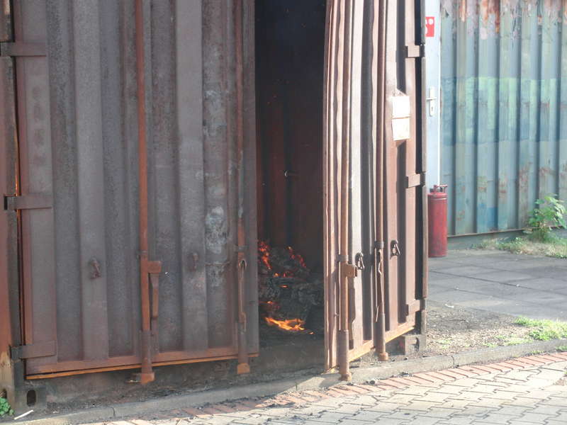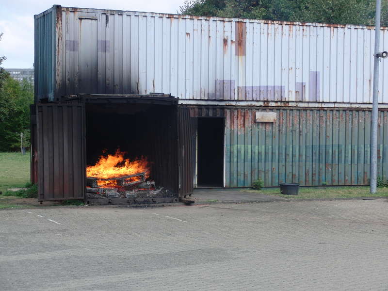 Das Tor zur Hölle? Nicht ganz. Das Bild zeigt die Frontalansicht der Wärmegewöhnungsanlage der Feuerwehr Köln. Links im Bild eine der beiden „Ofenkammern“.Auf dem Gelände der Feuerwache 6 in Chorweiler betreibt die Feuerwehr Köln eine Wärmegewöhnungsanlage, die den Einsatzkräften die Situation in einem brennenden Gebäude vermitteln soll. Die Teilnahme an diesem Lehrgang ist den Feuerwehrangehörigen freigestellt, das Seminar wird aber gerne angenommen. Wann hat man sonst schon die Möglichkeit, ein paar Erfahrungen zu sammeln, ohne sich im absoluten Gefahrenbereich aufzuhalten?