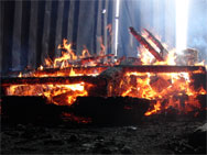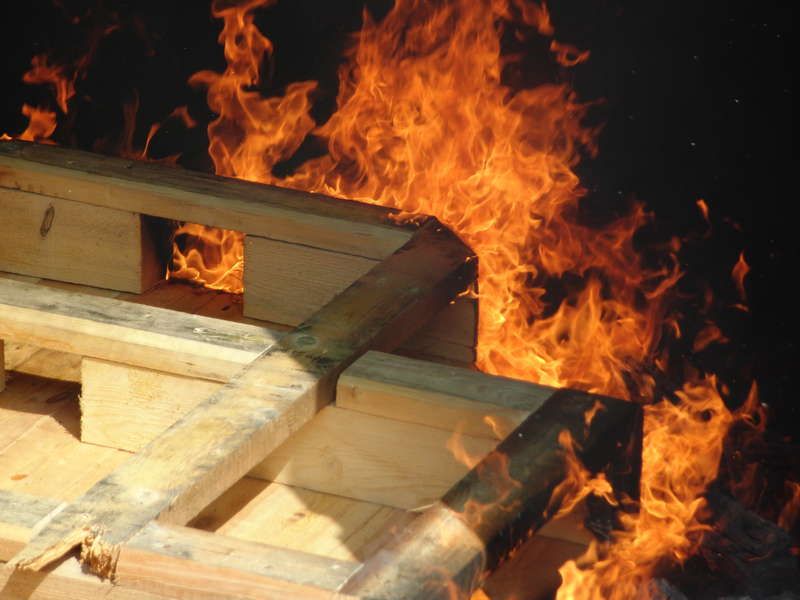 Blick auf das Feuer im Brandraum. Das Foto ist durch ein Loch im Container aufgenommen worden - eine Kamera mit in die Anlage zu nehmen würde dem Gerät sicher nicht bekommen.Nach der ersten Begegnung mit der vollen Hitze folgt ein weiterer Rundgang durch die Strecke. Diesmal ohne Feuerlöscher, dafür aber mit mehr Tempo. Zwischendurch fragt die Atemschutzüberwachung den niedrigsten Flaschendruck ab, dann geht es weiter. Am Ende wartet noch einmal der Brandraum. Über ein bereitliegendes Hohlstrahlrohr gibt der Ausbilder kurz Wasser ab. Das Feuer - davon kaum beeindruckt - brennt scheinbar