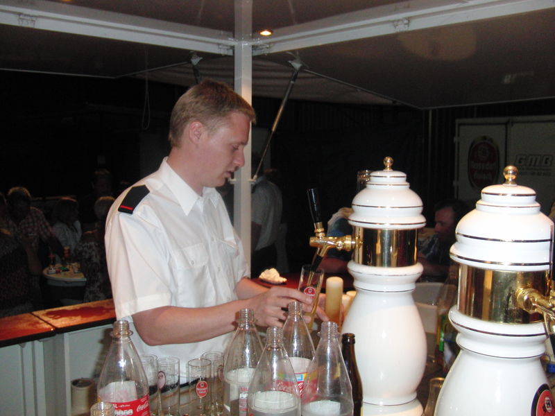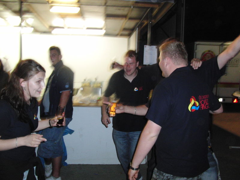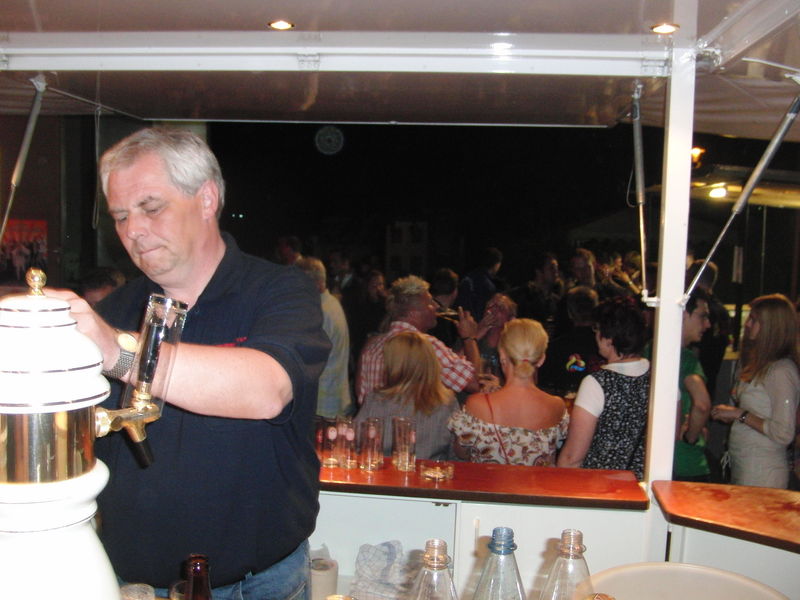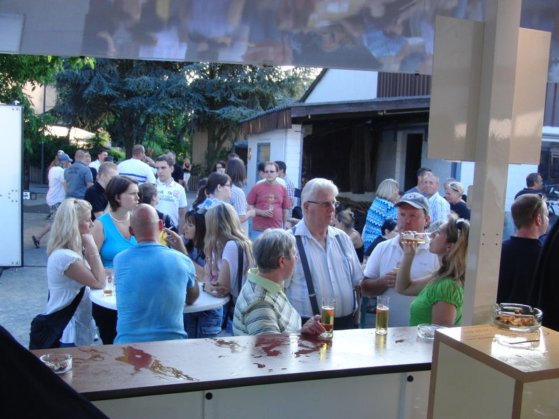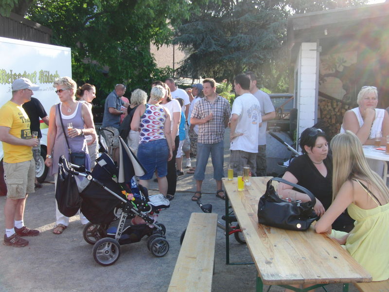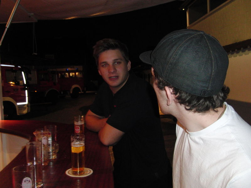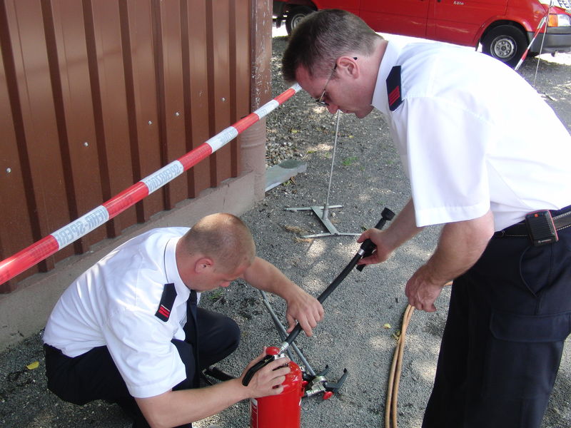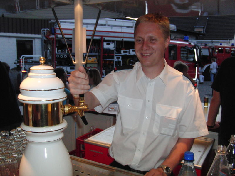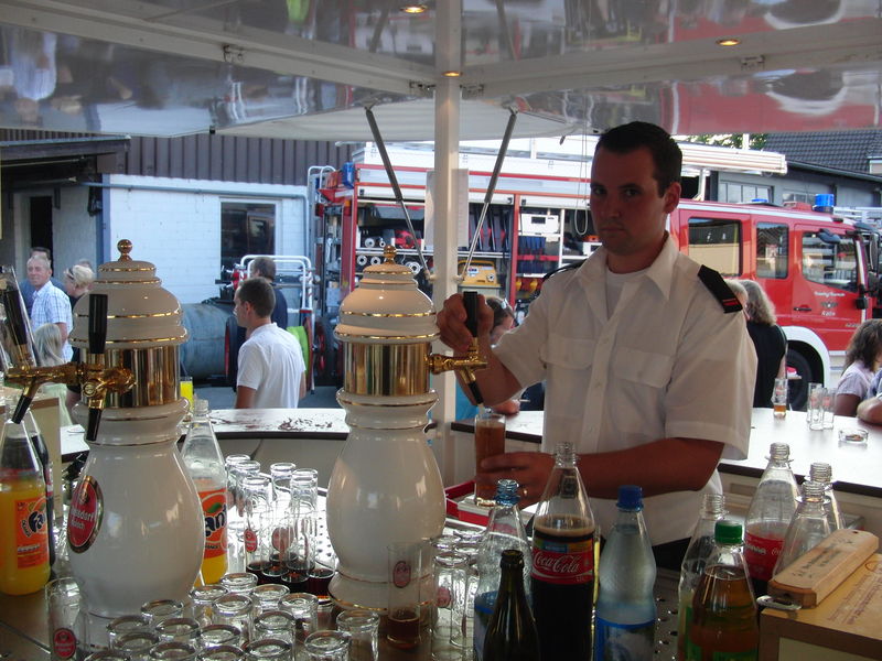 Einen Feuerlöscher ausprobieren wollten viele Besucher unseres Tags der offenen Tür.Gegen Abend trat das Kindertanzcorps der Großen Porzer KG Rot Weiß auf und markierte den Startschuss für den nun anstehenden Feier-Abend. Bei immer noch sehr warmen Temperaturen amüsierten sich unsere Gäste bis nach vier Uhr in die Nacht hinein. Die vom Junggesellenverein Libur zur Verfügung gestellte zweite Theke sorgte dabei für Entspannung an der Bierbude, die den Getränke-Bestellungen alleine kaum nachkommen konnte. Den ganzen Tag über herrschte schon eine wunderbare Stimmung, die dann am Abend ihren Höhepunkt fand. Auffallend viele bestens gelaunte Gäste hatten sichtlich Spaß dabei, mit uns einen Tag rund um rote Autos und die Feuerwehr zu verbringen.