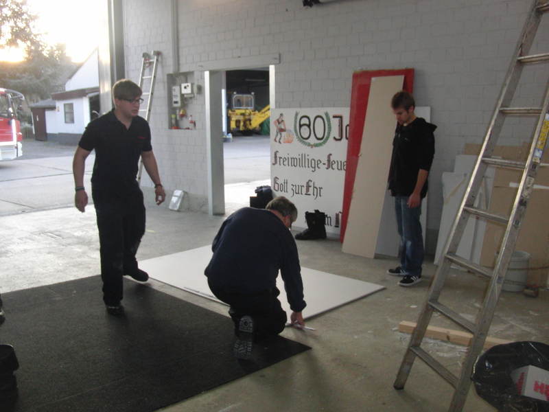 Von Kopf bis Fuß alles neu: Nach dem Einbau der Holzdecke wird hier gerade der neue Fußbodenbelag verlegt.Bei uns kam es in letzter Zeit häufig vor, dass in der Hektik eines beginnenden Einsatzes rund um die Spinde der Kameraden ein ziemliches Durcheinander und Gedrängel herrschte. Diesen Zustand mussten wir abstellen. Die Löschgruppe ist in letzter Zeit – vor allem in Hinblick auf die Größe der Einsatzabteilung – gewachsen, sodass ein größerer Umkleideraum die beste Lösung darstellte. Platz dafür war genug vorhanden, auch wenn dieser bisher als Lagerfläche genutzt wurde. Nach einer groß angelegten Entrümpelungsaktion konnten wir die Grundfläche unseres Umkleideraumes verdoppeln.