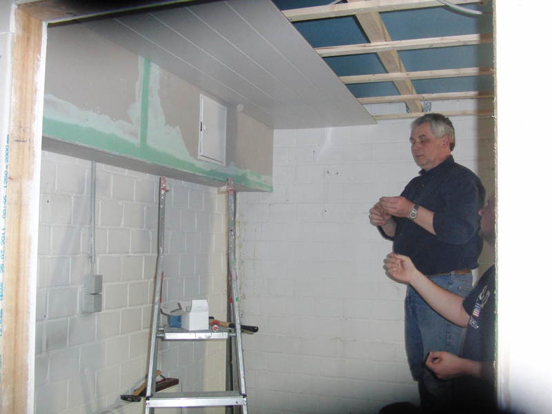 Die Deckenkonstruktion trägt nun eine weiße Holzdecke mit Halogen-Einbauspots.Just an dem Abend, an dem die Umkleide wieder ihrem Namen gerecht wurde, stand auch gleich die erste Bewährungsprobe an: Am 8. Mai rückten wir um etwa 22 Uhr zu einem Einsatz (